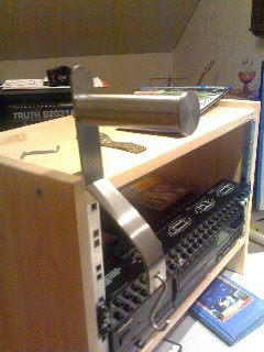 She says, "I modified Grundtal toilet roll holder to a nice headphone stand. It stands next to my new rack that is made also from Ikea materials. The moding was very easy. Just slowly bend the metal."